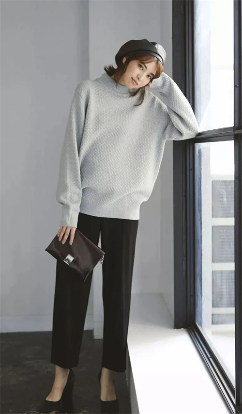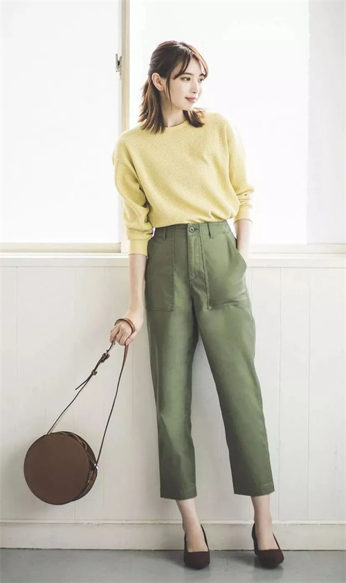 對比一下這兩張穿搭效果,左邊的黑褲子配灰色上衣,右邊的苔綠色褲子配櫻草黃上衣,是不是右邊這身穿搭會讓你更有明媚、輕盈的感覺?這就是色彩帶來的最直接的感知。